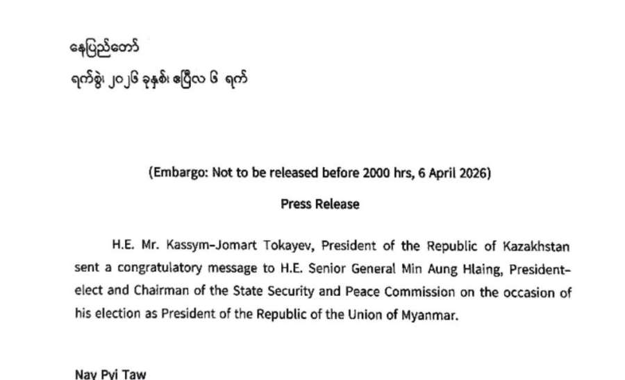 ပြည်ထောင်စုသမ္မတမြန်မာနိုင်ငံတော်၊ ရွေးကောက်တင်မြှောက်ခြင်းခံရသော သမ္မတ၊ နိုင်ငံတော်လုံခြုံရေးနှင့်အေးချမ်းသာယာရေးကော်မရှင်ဥက္ကဋ္ဌ ဗိုလ်ချုပ်မှူးကြီး မင်းအောင်လှိုင်ထံသို့ ကာဇက်စတန်သမ္မတနိုင်ငံသမ္မတ မစ္စတာ ကာစင်ဂျိုမတ် တိုခါယက်ဗ်ထံမှ ဝမ်းမြောက်ကြောင်းသဝဏ်လွှာ ပေးပို့