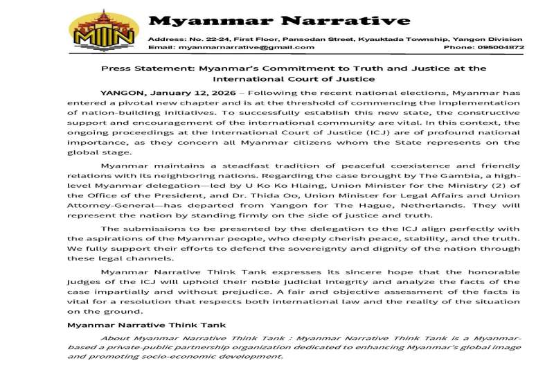 ရန်ကုန်မြို့၊ ၂၀၂၆ ခုနှစ်၊ ဇန်နဝါရီလ ၁၂ ရက် – မြန်မာနိုင်ငံသည် ရွေးကောက်ပွဲအပြီးတွင် သမိုင်းစာမျက်နှာအသစ်သို့ ကူးပြောင်းကာ နိုင်ငံတော်သစ် တည်ဆောက်ရေးလုပ်ငန်းစဉ်များကို စတင်ဖော်ဆောင်တော့မည့်အချိန်အခါဖြစ်ပါသည်။ ထိုသို့ နိုင်ငံသစ်တစ်ရပ်ကို အောင်မြင်စွာ တည်ဆောက်နိုင်ရန်အတွက် နိုင်ငံတကာအသိုက်အဝန်း၏ အပြုသဘောဆောင်သော အားပေးကူညီမှုများနှင့် ပူးပေါင်းဆောင်ရွက်မှုများသည် အထူးလိုအပ်လျက်ရှိပါသည်။ လက်ရှိတွင် အပြည်ပြည်ဆိုင်ရာတရားရုံး (ICJ) ၌ ရင်ဆိုင်နေရသော အမှုကိစ္စသည် မြန်မာနိုင်ငံကို ကိုယ်စားပြုသည့်အပြင် မြန်မာပြည်သူအားလုံး၏ အကျိုးစီးပွားနှင့် တိုက်ရိုက်သက်ဆိုင်သည့် ကိစ္စရပ်တစ်ခုလည်း ဖြစ်ပါသည်။