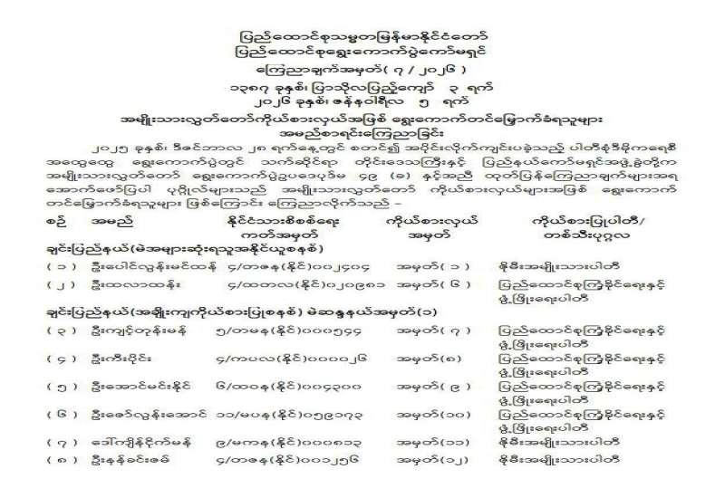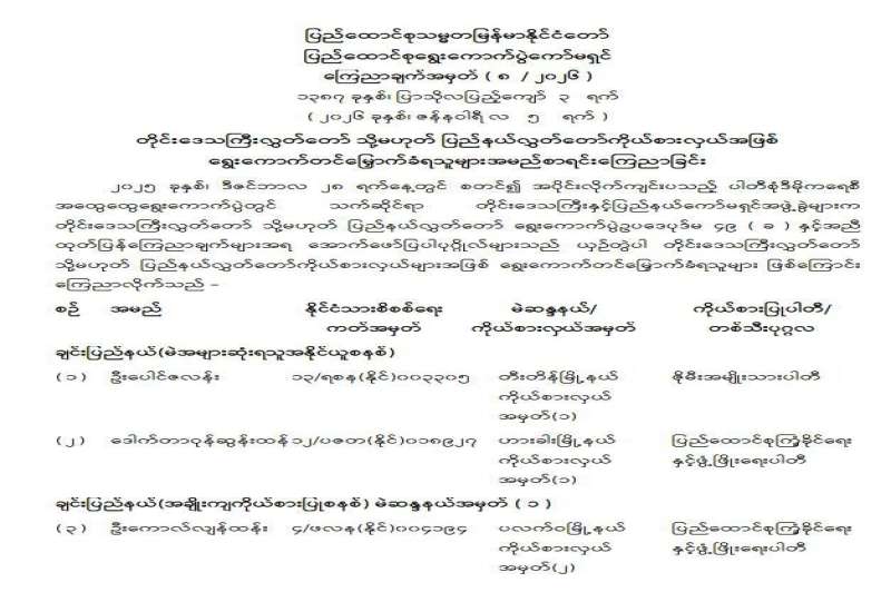 တိုင်းဒေသကြီးလွှတ်တော် သို့မဟုတ် ပြည်နယ်လွှတ်တော်ကိုယ်စားလှယ်အဖြစ် ရွေးကောက်တင်မြှောက်ခံရသူများ အမည်စာရင်းကြေညာခြင်း