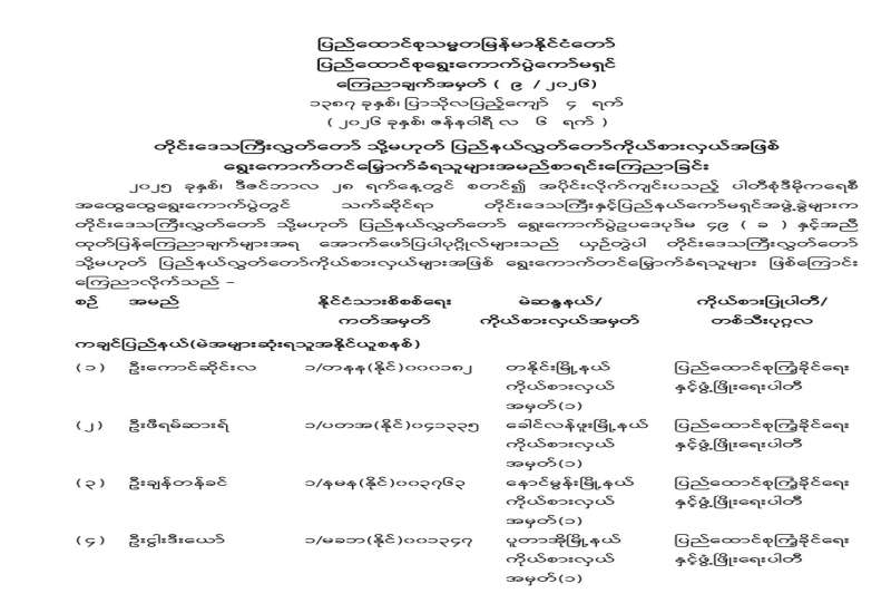 ပြည်ထောင်စုသမ္မတမြန်မာနိုင်ငံတော် ပြည်ထောင်စုရွေးကောက်ပွဲကော်မရှင် ကြေညာချက်အမှတ် (၉/၂၀၂၆) ၁၃၈၇ ခုနှစ်၊ ပြာသိုလပြည့်ကျော် ၄ ရက် (၂၀၂၆ ခုနှစ်၊ ဇန်နဝါရီလ ၆ ရက်) တိုင်းဒေသကြီးလွှတ်တော် သို့မဟုတ် ပြည်နယ်လွှတ်တော်ကိုယ်စားလှယ်အဖြစ် ရွေးကောက်တင်မြှောက်ခံရသူများအမည်စာရင်းကြေညာခြင်း