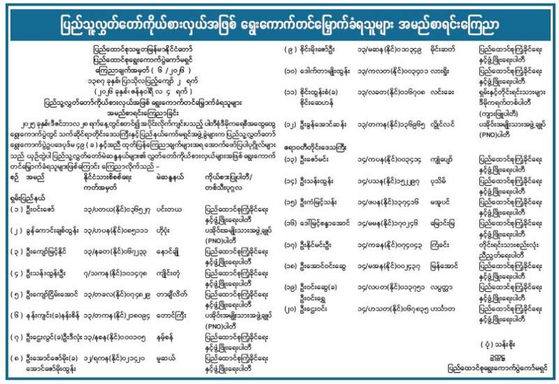 တိုင်းဒေသကြီးလွှတ်တော် သို့မဟုတ် ပြည်နယ်လွှတ်တော်ကိုယ်စားလှယ်အဖြစ် ရွေးကောက်တင်မြှောက်ခံရသူများအမည်စာရင်း ကြေညာခြင်း