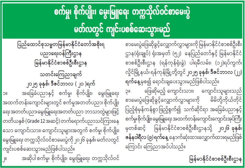 စက်မှု၊ စိုက်ပျိုး၊ မွေးမြူရေး တက္ကသိုလ်ဝင်စာမေးပွဲ မတ်လတွင် ကျင်းပစစ်ဆေးသွားမည်