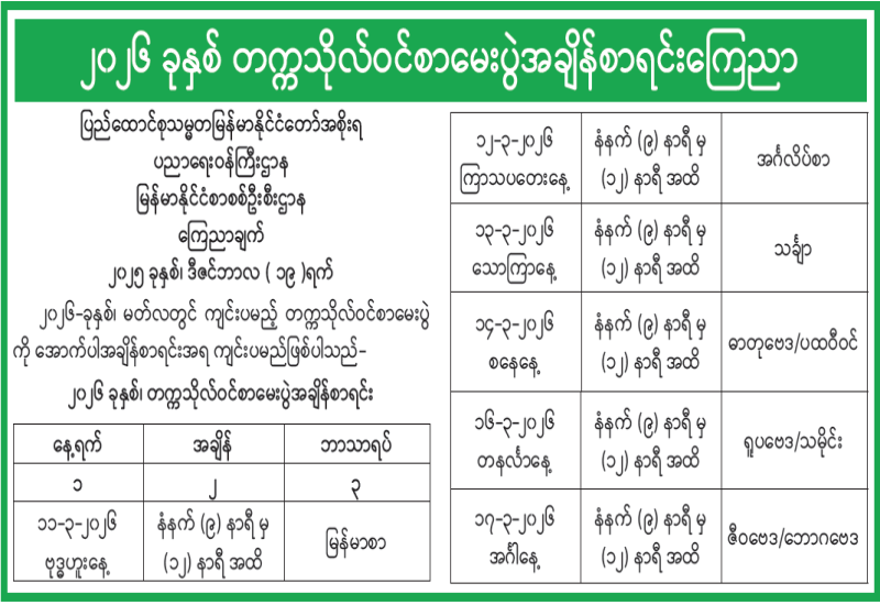 ၂၀၂၆ ခုနှစ် တက္ကသိုလ်ဝင်စာမေးပွဲအချိန်စာရင်း ကြေညာ