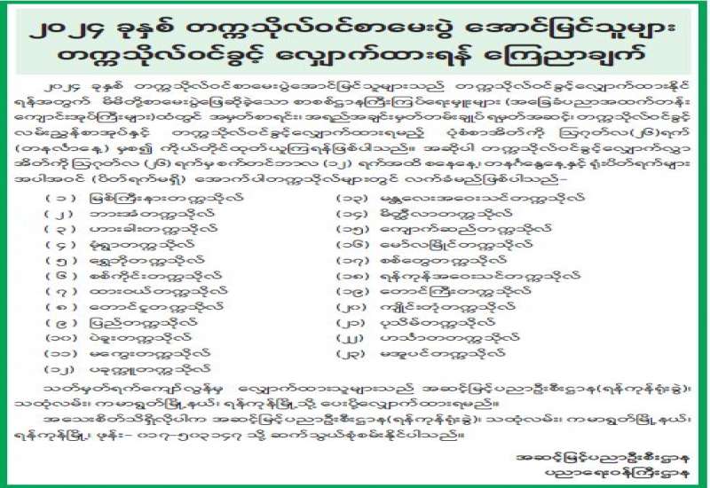 မြန်မာနိုင်ငံသတင်းမီဒီယာကောင်စီဝင်အဖြစ် တင်မြှောက်ခံရသူများနှင့်ရွေးချယ်တင်မြှောက်ပွဲတွင် ပါဝင်အရွေးချယ်ခံခွင့်ရှိသူများစာရင်းကို အသိပေးကြေညာခြင်း