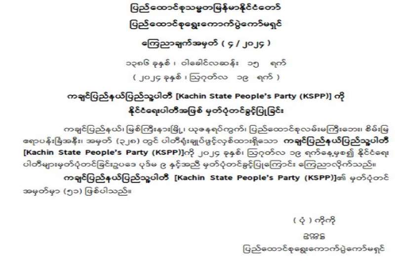 ကချင်ပြည်နယ်၊ မြစ်ကြီးနားမြို့၊ ယုဇနရပ်ကွက်၊ ပြည်ထောင်စုလမ်းမကြီးဘေး၊ စိမ်းမြဧရာပန်းခြံအနီး၊ အမှတ် (၃၂၈) တွင် ပါတီရုံးချုပ်ဖွင့်လှစ်ထားရှိသော ကချင်ပြည်နယ် ပြည်သူ့ပါတီ [Kachin State People’s Party (KSPP)] ကို ၂၀၂၄ ခုနှစ်၊ ဩဂုတ်လ ၁၉ ရက်နေ့မှစ၍ နိုင်ငံရေးပါတီများမှတ်ပုံတင်ခြင်းဥပဒေပုဒ်မ ၉ နှင့်အညီ မှတ်ပုံတင်ခွင့်ပြုကြောင်း ကြေညာလိုက်သည်။