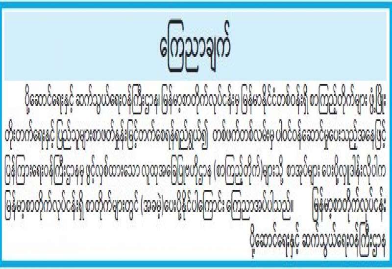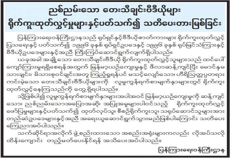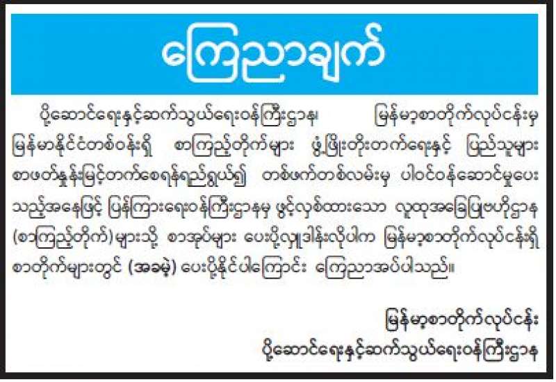 ပုံနှိပ်ခြင်းနှင့် ထုတ်ဝေခြင်းလုပ်ငန်းဥပဒေနှင့်အညီ စာအုပ်စာစောင်များပေးအပ်ရန် အသိပေးကြေညာချက်