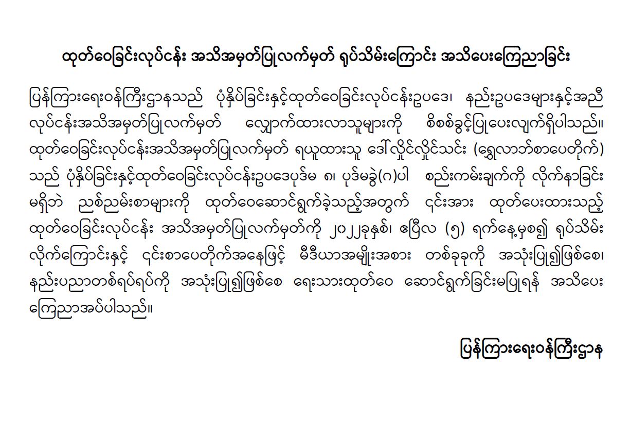 ထုတ်ဝေခြင်းလုပ်ငန်း အသိအမှတ်ပြုလက်မှတ် ရုပ်သိမ်းကြောင်း အသိပေးကြေညာခြင်း