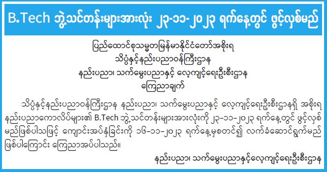 B.Tech ဘွဲ့သင်တန်းများအားလုံး ၂၃-၁၁-၂၀၂၃ ရက်နေ့တွင် ဖွင့်လှစ်မည်
