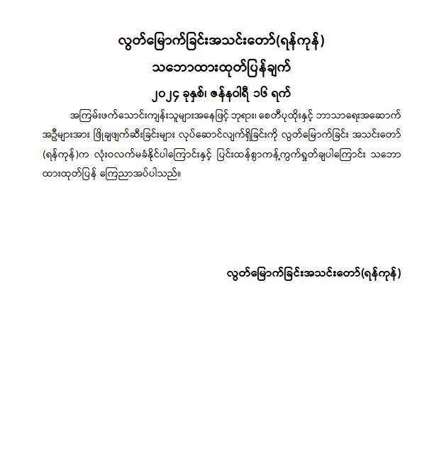 လွတ်မြောက်ခြင်းအသင်းတော်(ရန်ကုန်) သဘောထားထုတ်ပြန်ချက်