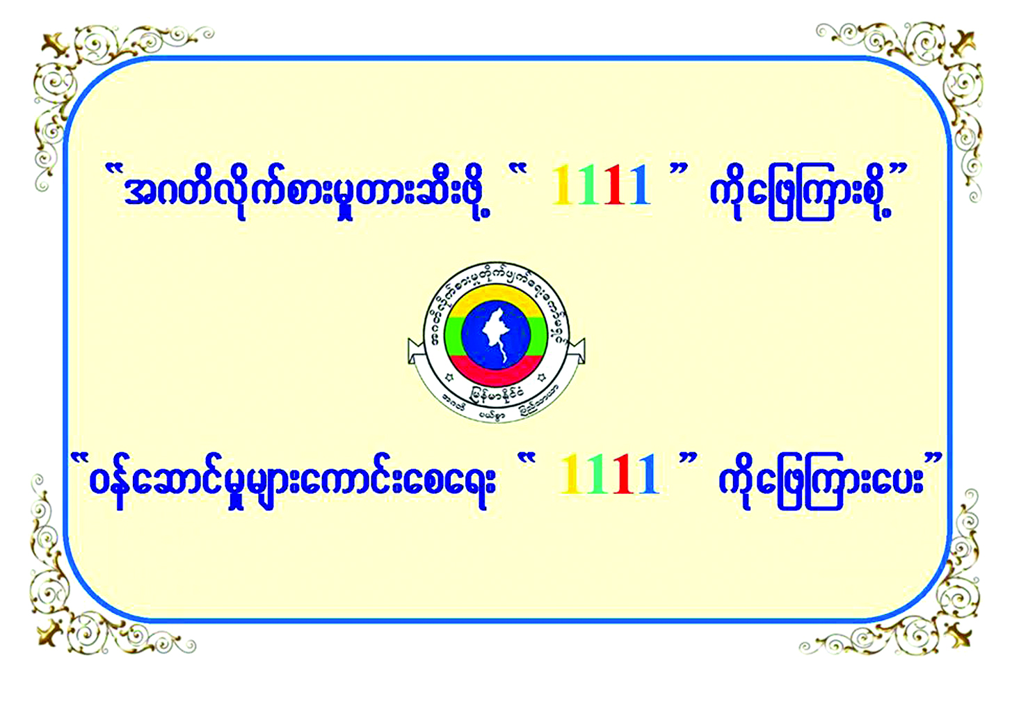 ၄။ သို့ဖြစ်ပါ၍ ပြည်သူလူထုအနေဖြင့် ကော်မရှင်နှင့် ပြည်ထောင်စုဝန်ကြီးဌာန/ အဖွဲ့အစည်းများရှိ အဂတိလိုက်စားမှုတားဆီးကာကွယ်ရေးအဖွဲ့များက Short Code “1111” ဖြင့် SMS ပေးပို့ မေးမြန်းလိုက်သောမေးခွန်းများကို ပြန်လည်ဖြေကြားပေးခြင်းသည် အဂတိလိုက်စားမှု တားဆီးကာကွယ်ရေးလုပ်ငန်းများတွင် တစ်ဖက်တစ်လမ်းမှ ပါဝင်ဆောင်ရွက်ခြင်းဖြစ်သဖြင့် အများပြည်သူထံမှ တုံ့ပြန်မှုရယူခြင်းအစီအစဉ်ကို အတူတကွ ပူးပေါင်းပါဝင်ဆောင်ရွက်စေလိုပါကြောင်း အသိပေးနှိုးဆော်တင်ပြအပ်ပါသည်။