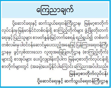 ပို့ဆောင်ရေးနှင့် ဆက်သွယ်ရေးဝန်ကြီးဌာန၊ မြန်မာ့စာတိုက်လုပ်ငန်းမှ မြန်မာနိုင်ငံတစ်ဝန်းရှိ စာကြည့်တိုက်များ ဖွံ့ဖြိုးတိုးတက်ရေးနှင့် ပြည်သူများ စာဖတ်နှုန်းမြင့်တက်စေရန် ရည်ရွယ်၍ တစ်ဖက်တစ်လမ်းမှ ပါဝင်ဝန်ဆောင်မှုပေးသည့်အနေဖြင့် ပြန်ကြားရေးဝန်ကြီးဌာနမှ ဖွင့်လှစ်ထားသော လူထုအခြေပြုဗဟိုဌာန (စာကြည့်တိုက်)များသို့ စာအုပ်များ ပေးပို့လှူဒါန်းလိုပါက မြန်မာ့စာတိုက်လုပ်ငန်းရှိ စာတိုက်များတွင် (အခမဲ့)ပေးပို့နိုင်ပါကြောင်း ကြေညာအပ်ပါသည်။