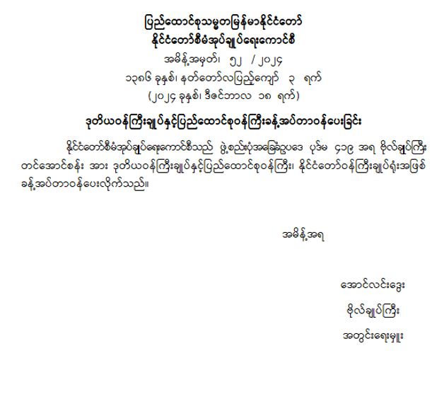 ဒုတိယဝန်ကြီးချုပ်နှင့် ပြည်ထောင်စုဝန်ကြီး ခန့်အပ်တာဝန်ပေးခြင်း