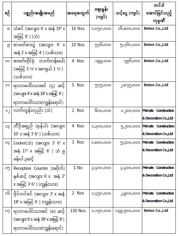 ပုံနှိပ်ရေးနှင့်ထုတ်ဝေရေးဦးစီးဌာနအတွက် ၂ဝ၂၅-၂ဝ၂၆ ဘဏ္ဍာရေးနှစ်၊ ငွေလုံးငွေရင်းအသုံးစရိတ်ဖြင့် ရုံးသုံး/ လုပ်ငန်းသုံးပရိဘောဂပစ္စည်း (၂၉) မျိုးမှ ပစ္စည်း (၂၃)မျိုးအား ဝယ်ယူရန် ပြည်တွင်း/ပြည်ပ ပစ္စည်းများ ဝယ်ယူရေးနှင့်ထုခွဲရောင်းချရေးကော်မတီမှ (၁၄-၈-၂ဝ၂၅) ရက် နံနက် (၁ဝ : ဝဝ) နာရီတွင် စိစစ်ခဲ့သည့် ဈေးနှုန်းများအနက် အနည်းဆုံးပေးသွင်းသည့် အောက်ပါကုမ္ပဏီများမှ ယှဉ်တွဲပါဈေးနှုန်း၊ အရေအတွက်တို့ဖြင့် တင်ဒါအောင်မြင်ကြောင်း ပြန်ကြားရေးဝန်ကြီးဌာန၊ စီမံခန့်ခွဲရေးကော်မတီအစည်းအဝေးအမှတ်စဉ် (၁၂/၂ဝ၂၅) ဆုံးဖြတ်ချက်အရ ကြေညာအပ်ပါသည်-