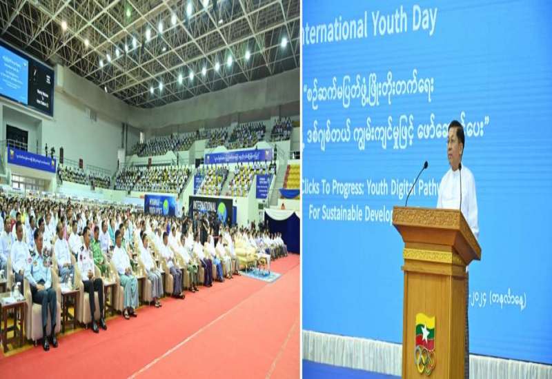 ၂၀၂၄ ခုနှစ်၊ အပြည်ပြည်ဆိုင်ရာ လူငယ်များနေ့အခမ်းအနားကို ယနေ့မွန်းလွဲပိုင်းတွင် နေပြည်တော်ရှိ ဝဏ္ဏသိဒ္ဓိအားကစားရုံ(C)၌ ကျင်းပပြုလုပ်ရာ နိုင်ငံတော်စီမံအုပ်ချုပ်ရေးကောင်စီဥက္ကဋ္ဌ နိုင်ငံတော်ဝန်ကြီးချုပ် ဗိုလ်ချုပ်မှူးကြီး မင်အောင်လှိုင် တက်ရောက်အမှာစကားပြောကြားသည်။