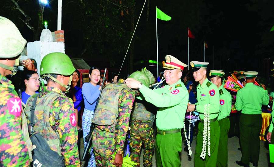 နိုင်ငံတော်တည်ငြိမ်ရေးနှင့် နယ်မြေအေးချမ်းသာယာရေးအတွက် ရခိုင်ပြည်နယ် ကျောက်ဖြူမြို့နယ် ဒေသတစ်ဝိုက် နယ်မြေလုံခြုံရေးတာဝန်များကို ထမ်းဆောင်၍ ပြန်လည်ရောက်ရှိလာသော ရှေ့တန်းပြန် နိုင်ငံ့သားကောင်း တပ်မတော်သားများအား ဂုဏ်ပြုကြိုဆိုခြင်းကို ယနေ့ညနေပိုင်းတွင် ရန်ကုန် တိုင်းဒေသကြီး လှည်းကူးမြို့နယ် ရဲမွန်တပ်မြို့ရှိ နယ်မြေခံတပ်ရင်း၌ပြုလုပ်ရာ ရန်ကုန်တိုင်းစစ်ဌာနချုပ်တိုင်းမှူး ဗိုလ်မှူးချုပ် တင်မင်းလတ်နှင့် တာဝန်ရှိသူများ၊ မြန်မာနိုင်ငံရဲတပ်ဖွဲ့ဝင်များ၊ မြန်မာနိုင်ငံစစ်မှုထမ်းဟောင်းအဖွဲ့ဝင်များ၊ ဌာနဆိုင်ရာ တာဝန်ရှိသူများနှင့် ဒေသခံပြည်သူများ ပါဝင်တက်ရောက်ဂုဏ်ပြုကြိုဆိုကြသည်။