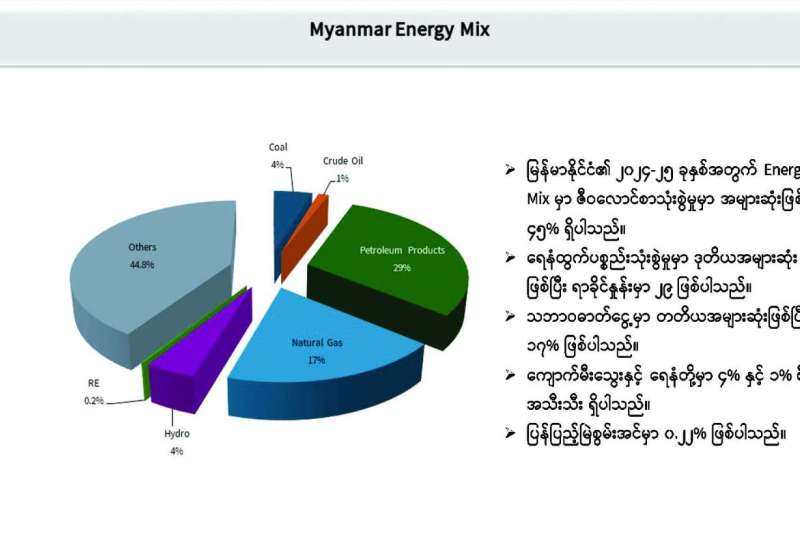 နိုင်ငံတော်၏စွမ်းအင်သုံးစွဲမှုတွင် ဓာတ်ဆီ၊ ဒီဇယ်ဆီ၊ ရေနံဓာတ်ငွေ့ရည် (LPG) စသည့် ရေနံထွက်ပစ္စည်းများသည် ၂၉ ရာခိုင်နှုန်း ပါဝင်ပြီး သယ်ယူပို့ဆောင်ရေးကဏ္ဍတွင် အဓိကအသုံးပြုလျက်ရှိပါသည်။
