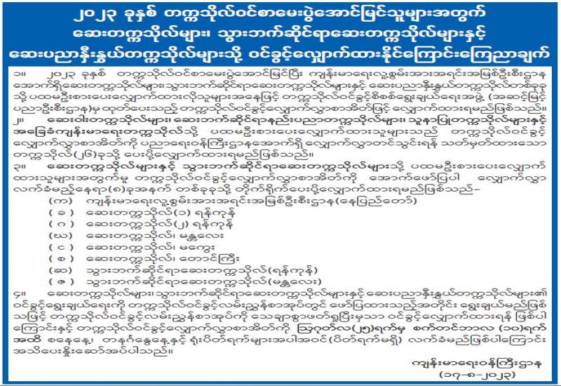 ၂၀၂၃ ခုနှစ် တက္ကသိုလ်ဝင်စာမေးပွဲအောင်မြင်သူများအတွက် ဆေးတက္ကသိုလ်များ၊ သွားဘက်ဆိုင်ရာ ဆေးတက္ကသိုလ်များနှင့် ဆေးပညာနှီးနွှယ်တက္ကသိုလ်များသို့ ဝင်ခွင့်လျှောက်ထားနိုင်ကြောင်း ကြေညာချက်