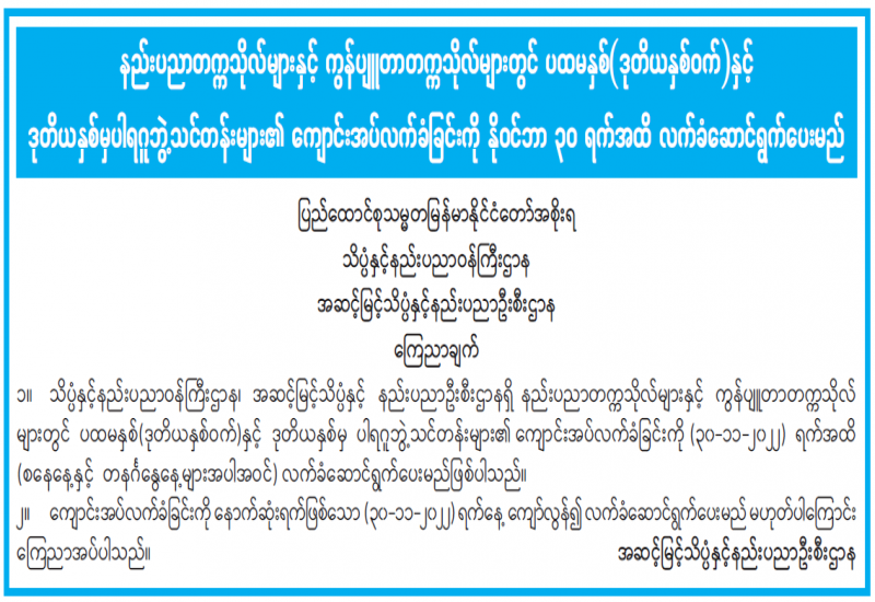 နည်းပညာတက္ကသိုလ်များနှင့် ကွန်ပျူတာတက္ကသိုလ်များတွင် ပထမနှစ်(ဒုတိယနှစ်ဝက်)နှင့် ဒုတိယနှစ်မှ ပါရဂူဘွဲ့သင်တန်းများ၏ ကျောင်းအပ်လက်ခံခြင်းကို နိုဝင်ဘာ ၃၀ ရက်အထိ လက်ခံဆောင်ရွက်ပေးမည်