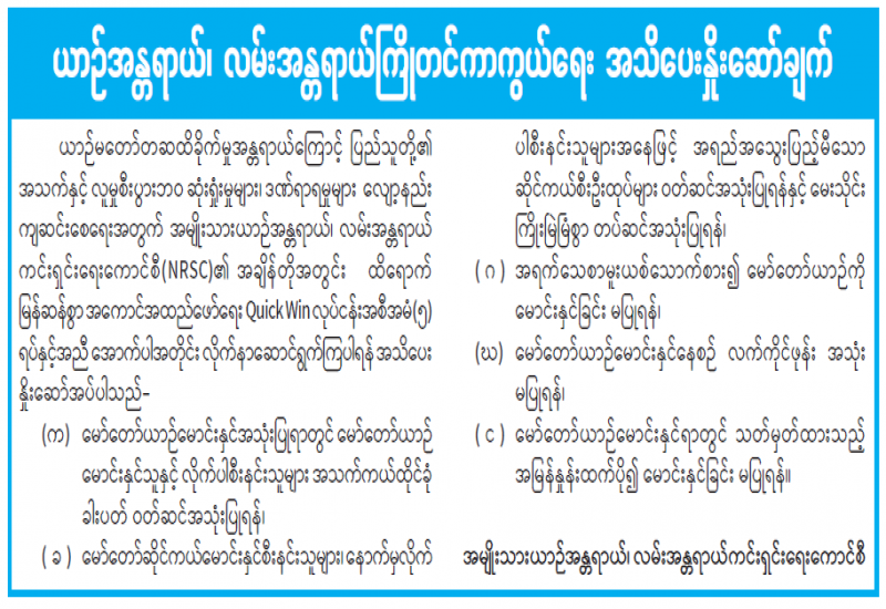နိုင်ငံတော်စီမံအုပ်ချုပ်ရေးကောင်စီ၏ လမ်းညွှန်စီမံခန့်ခွဲမှုဖြင့် နိုင်ငံ့စီးပွားမြှင့်တင်ရေး ရန်ပုံငွေဖြင့် စိုက်ပျိုးရေး၊ မွေးမြူရေးနှင့် ဆည်မြောင်းဝန်ကြီးဌာနက အကျိုးတူလယ်ယာစနစ် (Contract Farming) စနစ်အား အကောင်အထည်ဖော် ဆောင်ရွက်လျက်ရှိပါသည်။