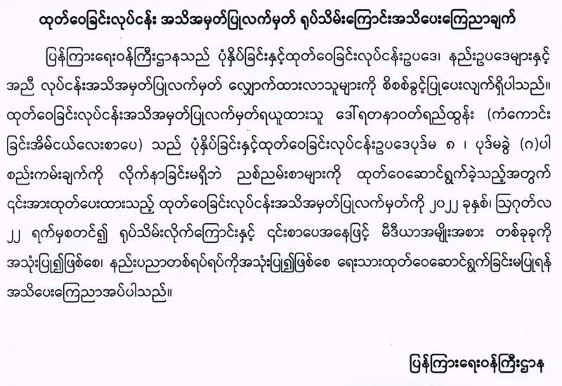 ထုတ်ဝေခြင်းလုပ်ငန်း အသိအမှတ်ပြုလက်မှတ် ရုပ်သိမ်းကြောင်း အသိပေးကြေညာချက်