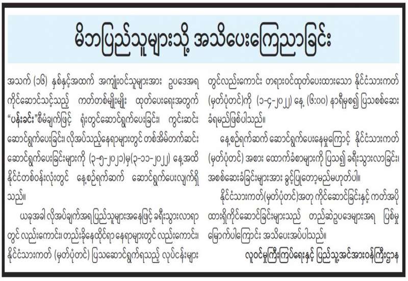 နိုင်ငံတော်စီမံအုပ်ချုပ်ရေးကောင်စီ၏ ၁၀.၁၂.၂၀၂၁ ရက်စွဲပါ အမိန့်ကြော်ငြာစာအမှတ်၊ ၃၆၆/၂၀၂၁ ဖြင့် တရားမဝင်ကုန်သွယ်မှုတိုက်ဖျက်ရေး ဦးဆောင်ကော်မတီကို ပြင်ဆင်ဖွဲ့စည်းခဲ့ပြီး တရားမဝင်ကုန်သွယ်မှုများကို ဥပဒေနှင့်အညီ ထိရောက်စွာအရေးယူနိုင်ရေး ဆောင်ရွက်လျက်ရှိရာ “ကုန်သွယ်မှုဆောင်ရွက်ရာတွင် ဌာနဆိုင်ရာအဖွဲ့အစည်းများမှ ငွေကြေးတောင်းခံမှုသတင်းများ” နှင့်ပတ်သက်၍ အောက်ဖော်ပြပါ တယ်လီဖုန်း၊ ဖက်စ်ဖုန်းနှင့် အီးမေးလ်လိပ်စာတို့ကို လုံခြုံစိတ်ချစွာတိုင်ကြားနိုင်ပါကြောင်း အသိပေးကြေညာအပ်ပါသည်-