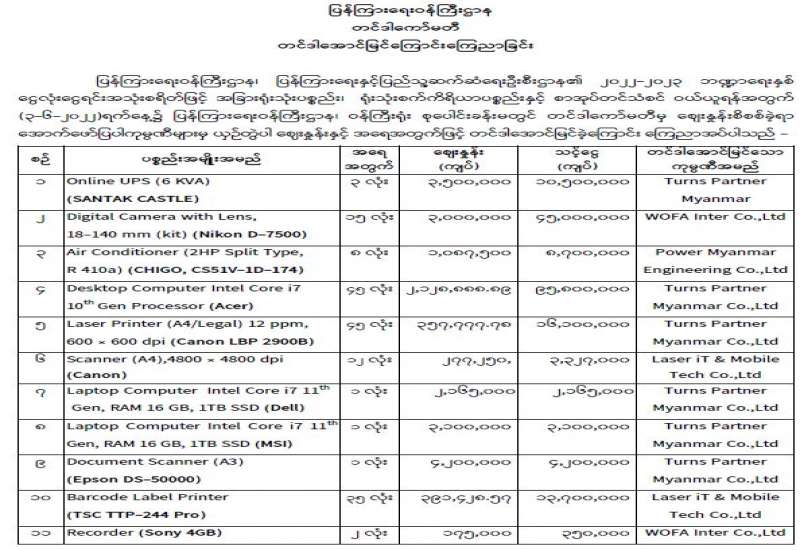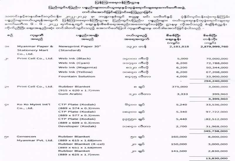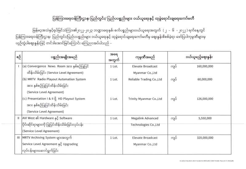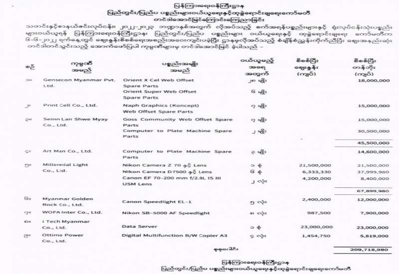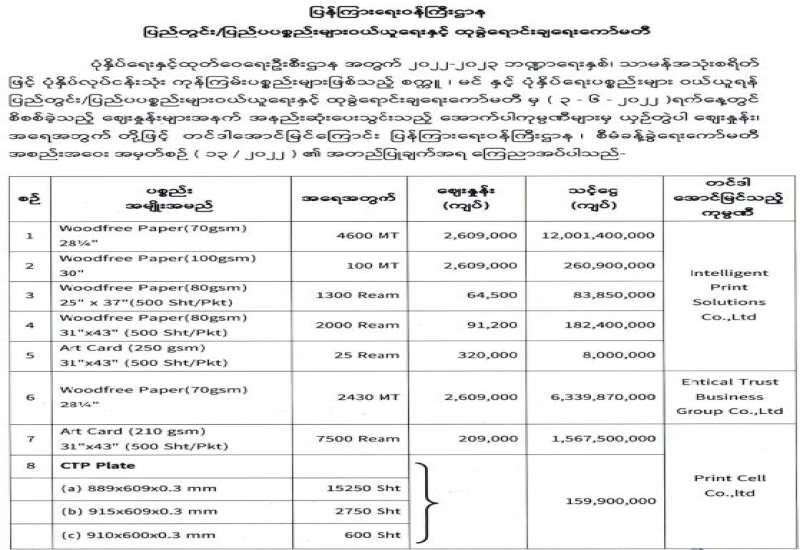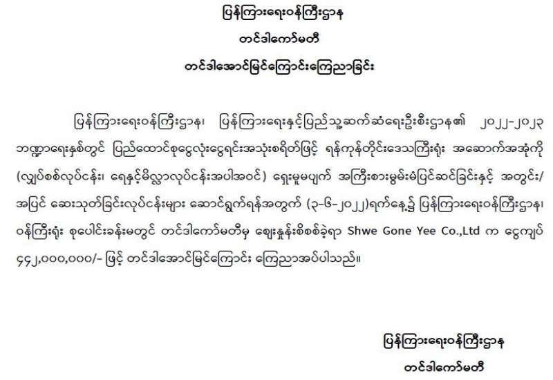 ပြန်ကြားရေးဝန်ကြီးဌာန၊ ပြည်တွင်း/ပြည်ပ ပစ္စည်းများဝယ်ယူရေးနှင့်ထုခွဲရောင်းချရေးကော်မတီအဖွဲ့၊ တင်ဒါအောင်မြင်ကြောင်းကြေညာခြင်း
