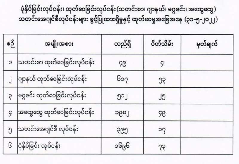 ၁။ စိုက်ပျိုးရေး၊ မွေးမြူရေးနှင့်ဆည်မြောင်းဝန်ကြီးဌာန၊ ငါးလုပ်ငန်းဦးစီးဌာနသည် မြန်မာ့ပင်လယ် ငါးလုပ်ငန်းရေပြင်အတွင်း ငါးဖမ်းလုပ်ငန်း လုပ်ကိုင်ဆောင်ရွက်နေသော နိုင်ငံသားပိုင် ကမ်းဝေးငါးဖမ်းရေယာဉ်များနှင့် ကမ်းနီးငါးဖမ်းရေယာဉ်များအနေဖြင့် မုတ်သုံရာသီအတွင်း ရာသီဥတုဆိုးရွားချိန်များတွင် လှိုင်းဒဏ်၊ လေဒဏ်များ ခိုလှုံနိုင်ရန်အတွက် အောက်ဖော်ပြပါတည်နေရာများ၌ ရာသီဥတုခိုလှုံနိုင်ပါကြောင်းကို (၂-၆-၂၀၂၂)ရက်စွဲပါ ညွှန်ကြားချက်အမှတ်၊ ၄/၂၀၂၂ ဖြင့် ထုတ်ပြန်ပေးထားပြီး ဖြစ်ပါသည်-