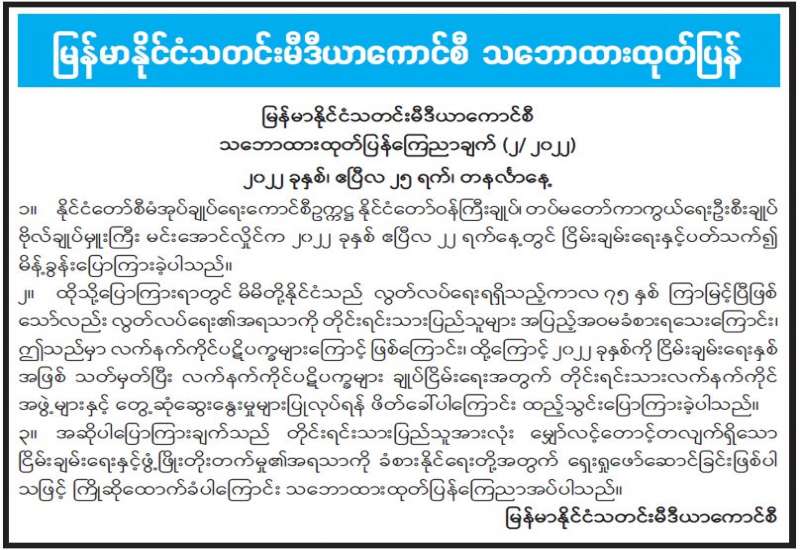 တပ်မတော်အနေဖြင့် ပြည်သူလူထုတစ်ရပ်လုံး လိုလားတောင့်တလျက်ရှိသည့် ထာဝရငြိမ်းချမ်းရေးရရှိရန် ဦးတည်၍ ၂၀၂၂ ခုနှစ် နှစ်ကုန်ပိုင်း အထိ ပစ်ခတ်တိုက်ခိုက်မှုများကို ရပ်စဲပေးထားပြီး အဘက်ဘက်မှ ကြိုးပမ်းဆောင်ရွက်လျက်ရှိသည်။