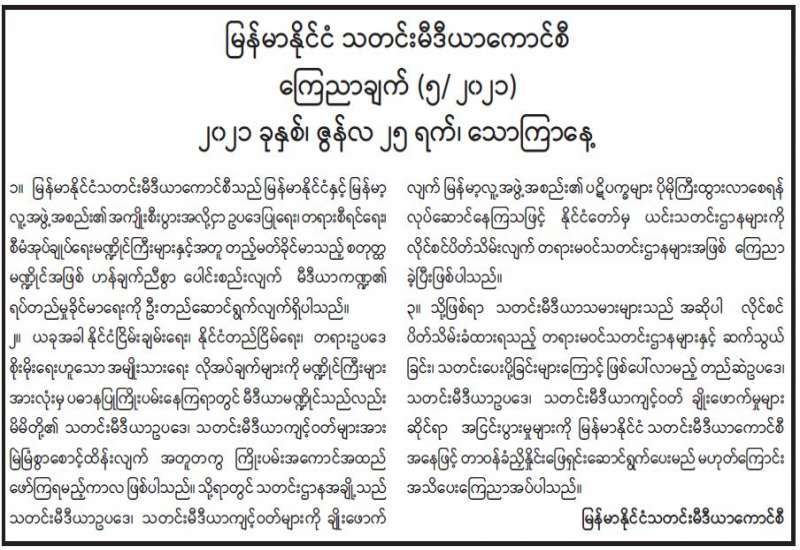 မြန်မာနိုင်ငံသတင်းမီဒီယာကောင်စီ ကြေညာချက် (၅/၂၀၂၁) ၂၀၂၁ ခုနှစ်၊ ဇွန်လ ၂၅ ရက်၊ သောကြာနေ့