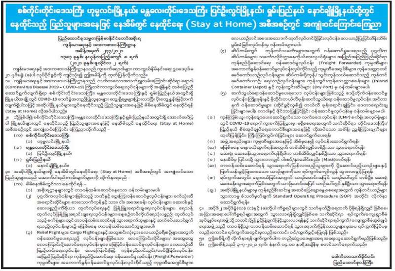 စစ်ကိုင်းတိုင်းဒေသကြီး ဟုမ္မလင်းမြို့နယ်၊ မန္တလေးတိုင်းဒေသကြီး ပြင်ဦးလွင်မြို့နယ်၊ ရှမ်းပြည်နယ် နောင်ချိုမြို့နယ်တို့တွင် နေထိုင်သည့် ပြည်သူများအနေဖြင့် နေအိမ်တွင် နေထိုင်ရေး (Stay at Home) အစီအစဉ်တွင် အကျုံးဝင်ကြောင်း ကြေညာ