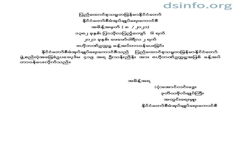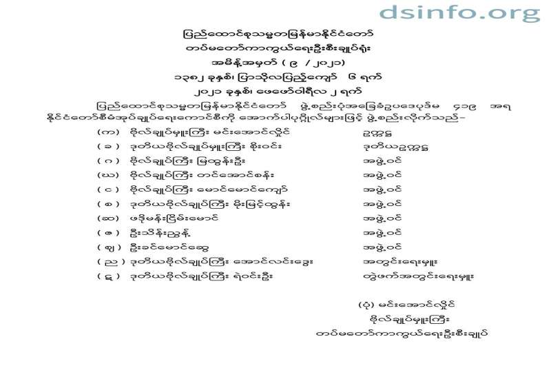 ပြည်ထောင်စုသမ္မတမြန်မာနိုင်ငံတော် နိုင်ငံတော်စီမံအုပ်ချုပ်ရေးကောင်စီ အမိန့်အမှတ်(၂/၂၀၂၁) ၁၃၈၂ ခုနှစ်၊ ပြာသိုလပြည့်ကျော် ၆ ရက် ၂၀၂၁ ခုနှစ်၊ ဖေဖော်ဝါရီလ ၂ ရက် ပြည်ထောင်စုစာရင်းစစ်ချုပ် ခန့်အပ်တာဝန်ပေးခြင်း