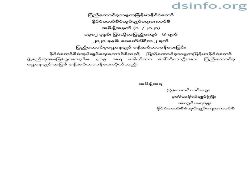 ပြည်ထောင်စုသမ္မတမြန်မာနိုင်ငံတော် နိုင်ငံတော်စီမံအုပ်ချုပ်ရေးကောင်စီ အမိန့်အမှတ်(၇/၂၀၂၁) ၁၃၈၂ ခုနှစ်၊ ပြာသိုလပြည့်ကျော် ၆ ရက် ၂၀၂၁ ခုနှစ်၊ ဖေဖော်ဝါရီလ ၂ ရက် ပြည်ထောင်စုရွေးကောက်ပွဲကော်မရှင်ဥက္ကဋ္ဌနှင့်အဖွဲ့ဝင်များ ခန့်အပ်တာဝန်ပေးခြင်း
