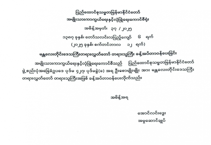ပြည်တွင်းနှင့် နိုင်ငံတကာရွေးကောက်ပွဲ စောင့်ကြည့်လေ့လာသူများ အထွေထွေရွေးကောက်ပွဲ စောင့်ကြည့်လေ့လာခွင့် လျှောက်ထားခြင်းနှင့်စပ်လျဉ်း၍ အသိပေးကြေညာ
