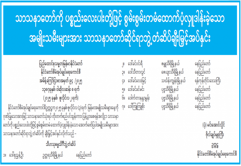 သာသနာတော်ကို ပစ္စည်းလေးပါးတို့ဖြင့် စွမ်းစွမ်းတမံထောက်ပံ့လှူဒါန်းခဲ့သော အမျိုးသမီးများအား သာသနာတော်ဆိုင်ရာဘွဲ့တံဆိပ်ချီးမြှင့်အပ်နှင်း