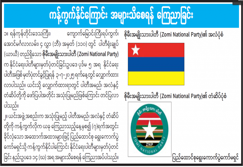 ၁။ ရခိုင်ပြည်နယ်၊ ကျောက်ဖြူမြို့၊ အလယ်ပိုင်းရပ်ကွက်၊ ဦးဥတ္တမလမ်း၊ အမှတ် (၄၉) တွင် ပါတီရုံးချုပ်တည်ရှိသော ရခိုင်တိုင်းရင်းသားများပါတီ (Rakhine Nationalities Party) က နိုင်ငံရေးပါတီများ မှတ်ပုံတင်ခြင်းဥပဒေ ပုဒ်မ ၅ အရ နိုင်ငံရေးပါတီအဖြစ် မှတ်ပုံတင်ခွင့်ပြုရန် ၂၄-၆-၂၀၂၅ ရက်နေ့တွင် လျှောက်ထားလာပါသည်။ ယင်းသို့ လျှောက်ထားရာတွင် ပါတီအမည်၊ အလံနှင့် တံဆိပ်တို့ကို ဖော်ပြပါအတိုင်း အသုံးပြုမည်ဖြစ်ကြောင်း တင်ပြလာပါသည်။