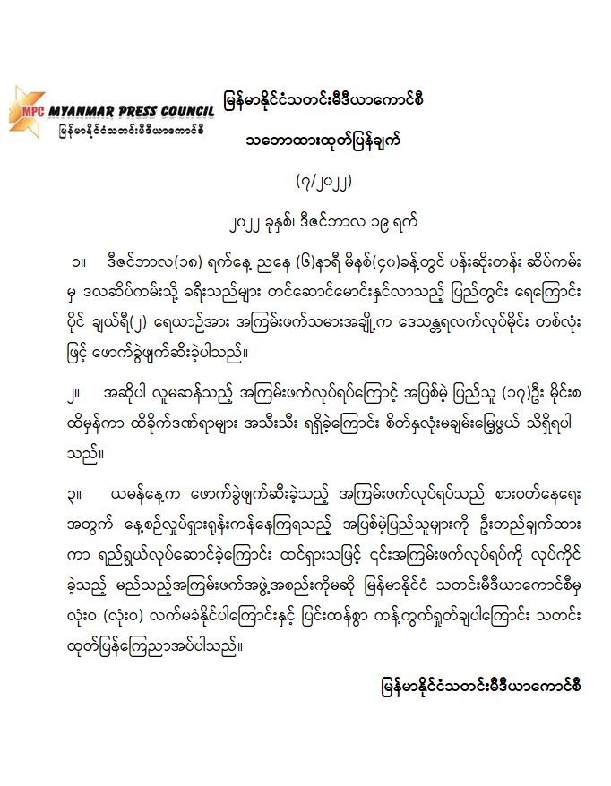 မြန်မာနိုင်ငံသတင်းမီဒီယာကောင်စီ သဘောထားထုတ်ပြန်ချက်