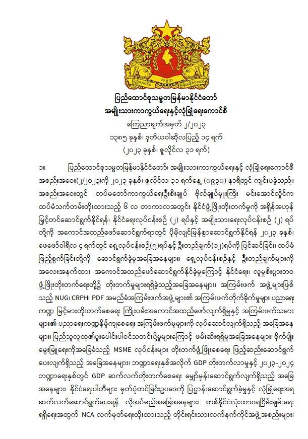 ၂။ တပ်မတော်ကာကွယ်ရေးဦးစီးချုပ်၏ တင်ပြချက်အပေါ် အမျိုးသားကာကွယ်ရေးနှင့် လုံခြုံရေးကောင်စီအဖွဲ့ဝင်များက ဝိုင်းဝန်းသုံးသပ်ဆွေးနွေးခဲ့ကြပါသည်။ ယာယီသမ္မတအပါအဝင် အမျိုးသားကာကွယ်ရေးနှင့် လုံခြုံရေးကောင်စီအဖွဲ့ဝင်အားလုံးက နိုင်ငံတော်စီမံအုပ်ချုပ်ရေးကောင်စီအနေဖြင့် နိုင်ငံတော်တည်ငြိမ်အေးချမ်းပြီး အဖက်ဖက်ကဖွံ့ဖြိုးတိုးတက်အောင် ဆောင်ရွက်ပေးလျက်ရှိသော်လည်း နိုင်ငံတော်အား အလုံးစုံပျက်သုဉ်းစေလိုသည့် CRPH ၊ NUG နှင့် ၎င်းတို့၏ လက်ဝေခံ PDF တို့က အပြစ်မဲ့ပြည်သူများကို သတ်ဖြတ်ခြင်း၊ အများပြည်သူဆိုင်ရာနေရာများကို အကြမ်းဖက်ဗုံးခွဲတိုက်ခိုက်ခြင်း၊ နိုင်ငံ၏ပညာရေး နိမ့်ပါးကျဆင်းစေရန် ဘက်ပေါင်းစုံမှလုပ်ဆောင်ခြင်း၊ အများပြည်သူ သွားလာအသုံးပြုလျက်ရှိသည့် လမ်း၊ တံတား၊ မီးရထားလမ်းများကို ဖောက်ခွဲဖျက်ဆီးတိုက်ခိုက်ခြင်းများကို လုပ်ဆောင်လျက်ရှိကြောင်း ဆွေးနွေးခဲ့ကြသည်။ အကြမ်းဖက် အဖွဲ့အစည်းများအနေဖြင့် နိုင်ငံတော်တည်ငြိမ်အေးချမ်းရေး၊ တရားဥပဒေစိုးမိုးရေးတို့ကို ပျက်ပြားစေရုံသာမကဘဲ ပြည်သူလူထုကို အကြောက်တရားဖြင့်လွှမ်းမိုးကာ နိုင်ငံတော်၏အာဏာကို အကြမ်းဖက်မှုနည်းလမ်းများဖြင့်ရယူရန် ကြိုးပမ်းလုပ်ဆောင်လျက်ရှိသည့် အခြေအနေရှိနေဆဲ ဖြစ်ကြောင်းဆွေးနွေးခဲ့ကြသည်။ ၎င်းအပြင် ရွေးကောက်ပွဲ ကျင်းပပြုလုပ်နိုင်ရေးအတွက် နိုင်ငံရေးပါတီများ၏ ပြင်ဆင်ချိန်၊ စည်းရုံးချိန်များတွင် လုံခြုံရေးအရခြိမ်းခြောက်မှုများ တွေ့ကြုံနေရခြင်း၊ မဲစာရင်းများမှန်ကန်တိကျမှုရှိစေရေးအတွက် သန်းခေါင်စာရင်းကောက်ယူမှုလုပ်ငန်းများ ဆောင်ရွက် ဆဲဖြစ်ခြင်း၊ ရွေးကောက်ပွဲကျင်းပပြုလုပ်ရာတွင် လွတ်လပ်၍တရားမျှတပြီး အကြောက်တရားကင်းစွာဖြင့် မဲပေးနိုင်ရေးအတွက် လိုအပ်သည့်လုံခြုံရေးလုပ်ငန်းများ ဆောင်ရွက်ရန် လိုအပ်ဆဲဖြစ်ခြင်းတို့ကြောင့် အရေးပေါ်ကာလကို သက်တမ်းတိုးမြှင့်ပေးရန်လိုအပ်မည်ဖြစ်ကြောင်း ဆွေးနွေးခဲ့ကြသည်။ ဆွေးနွေးချက်၊ ဆုံးဖြတ်ချက်များအရ တပ်မတော်ကာကွယ်ရေးဦးစီးချုပ်က လုပ်ငန်းတာဝန်များပြီးမြောက်အောင် ဆောင်ရွက်နိုင်ရန်အတွက် ပြည်ထောင်စုသမ္မတမြန်မာနိုင်ငံတော် ဖွဲ့စည်းပုံအခြေခံဥပဒေပုဒ်မ ၄၂၅ အရလည်းကောင်း၊ ၂၀၂၃ ခုနှစ်၊ ဖေဖော်ဝါရီ ၁ ရက်နေ့တွင် ထုတ်ပြန်ခဲ့သည့် နိုင်ငံတော်ဖွဲ့စည်းပုံအခြေခံဥပဒေဆိုင်ရာခုံရုံး၏ သဘောထားထုတ်ပြန်ချက်အရ လည်းကောင်း နိုင်ငံတစ်ဝန်းလုံး အရေးပေါ်အခြေအနေကြေညာထားသည့်ကာလအား ၂၀၂၃ ခုနှစ် ဩဂုတ်လ ၁ ရက်နေ့မှစ၍ နောက်ထပ် (၆) လ သက်တမ်းတိုးမြှင့်လိုက်သည်။