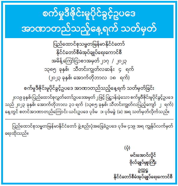 စက်မှုဒီဇိုင်းမူပိုင်ခွင့်ဥပဒေ အာဏာတည်သည့်နေ့ရက် သတ်မှတ် 10/19/2023 စက်မှုဒီဇိုင်းမူပိုင်ခွင့်ဥပဒေ အာဏာတည်သည့်နေ့ရက် သတ်မှတ်