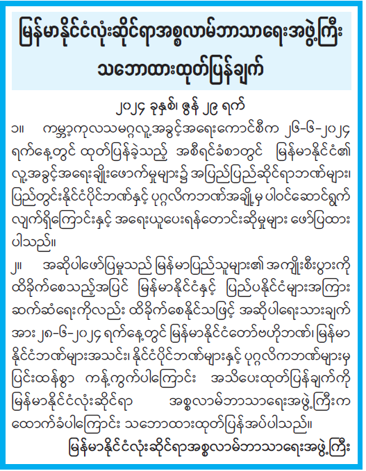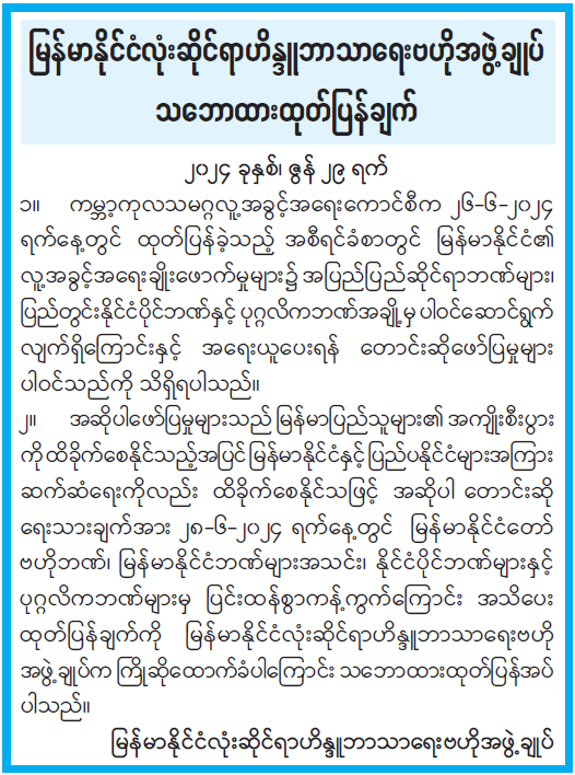အဆိုပါ ကမ္ဘာ့ကုလသမဂ္ဂလူ့အခွင့်အရေးကောင်စီ၏ အစီရင်ခံစာပါ ရေးသားချက်များအပေါ် ပြင်းထန်စွာ ကန့်ကွက်ကြောင်း မြန်မာနိုင်ငံတော်ဗဟိုဘဏ်၊ မြန်မာနိုင်ငံဘဏ်များအသင်း၊ နိုင်ငံပိုင်ဘဏ်များ၊ ပုဂ္ဂလိကဘဏ်များ၏ သဘောထားထုတ်ပြန်ချက်ကို မြန်မာနိုင်ငံသတင်းမီဒီယာကောင်စီ၊ ဗုဒ္ဓဘာသာကလျာဏယုဝအသင်းYMBA (ဗဟို)၊ ဘာသာပေါင်းစုံ ချစ်ကြည်ညီညွတ်ရေးအဖွဲ့ (ဗဟို)၊ သနန္တနဓမ္မပါလက (ဟိန္ဒူ) အဖွဲ့ချုပ်၊ ပြည်ထောင်စုမြန်မာနိုင်ငံမက်သဒစ်အသင်းတော် (အောက်မြန်မာပြည်)၊ မြန်မာနိုင်ငံလုံးဆိုင်ရာ အစ္စလာမ်ဘာသာရေးအဖွဲ့ကြီး၊ ပိန္နဲကုန်းရခိုင်ဂျာမေဗလီ၊ ဘူးသီးတောင် မောင်တောဒေသဖွံ့ဖြိုးရေးအသင်း၊ မြန်မာနိုင်ငံ ဧဝံဂေလိခရစ်ယာန်မဟာမိတ်အဖွဲ့ချုပ်၊ လွတ်မြောက်ခြင်းအသင်းတော် (ရန်ကုန်)၊ မြန်မာနိုင်ငံလုံးဆိုင်ရာ ဟိန္ဒူဘာသာရေးဗဟိုအဖွဲ့ချုပ်၊ ယုံကြည်ခြင်းဧဝံဂေလိအသင်းတော် (ပဲခူး)၊ မြန်မာနိုင်ငံလုံးဆိုင်ရာ တမီလ်ဟိန္ဒူဖောင်ဒေးရှင်း(ဗဟို)၊ မြန်မာနိုင်ငံဂီတအစည်းအရုံး (ဗဟို)၊ မြန်မာနိုင်ငံသဘင်အစည်းအရုံး (ဗဟို)၊ မြန်မာနိုင်ငံရုပ်ရှင်အစည်းအရုံး၊ မြန်မာနိုင်ငံဟာသပညာရှင်များအစည်းအရုံး၊ မြန်မာနိုင်ငံစာရေးဆရာအသင်း၊ မြန်မာနိုင်ငံပန်းချီပန်းပုအစည်းအရုံး(ဗဟို)နှင့် မြန်မာနိုင်ငံအားကစားမီဒီယာများအဖွဲ့ချုပ်တို့မှ ထောက်ခံကြိုဆိုပါကြောင်း သဘောထားများ အသီးသီးထုတ်ပြန်ခဲ့ကြကြောင်း သတင်းရရှိသည်။