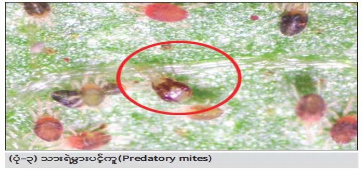 သဘာဝတွင် မွှားပင့်ကူများနှင့် အတူတကွ ယှဉ်တွဲတွေ့ရှိရသော သားရဲကောင်များဖြစ်သည့် ခြောက်ပြောက် ပါလှေးပိုး (6 Spotted Thrips)၊ အနက် ရောင် လိပ်ခုံးကျိုင်းငယ်(Stethorus spp.)၊ အခြား အကျိုးပြု လိပ်ခုံးကျိုင်း၊ သားရဲ မွှားပင့်ကူများ (Predatory mites)(ပုံ-၃)နှင့် အစိမ်းရောင် ဇာတောင်ပိုး (Green lacewing)၏ အရွယ်မရောက်ကောင်အဆင့်(ပုံ-၄)တို့ကို အသုံးပြုခြင်း အားဖြင့်လည်း နှိမ်နင်းနိုင်သည်။ သို့သော် ဤနည်းမှာ လက်ရှိအခြေအနေတွင် မြန်မာနိုင်ငံ၌ အသုံးမပြုနိုင်သေးပေ။