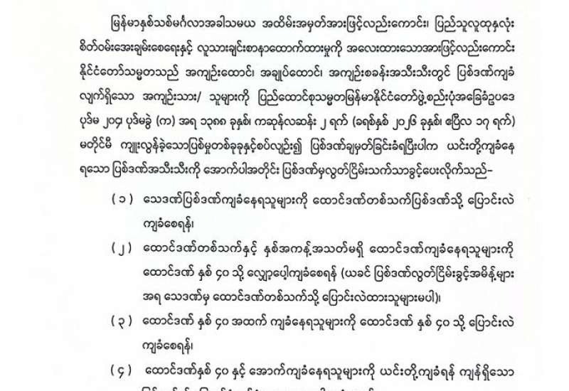 တပ်မတော်အနေဖြင့် တိုင်းစစ်ဌာနချုပ်နယ်မြေအသီးသီးရှိ ထေရ်ကြီးဝါကြီး ဆရာတော်ကြီးများ အပါအဝင် လူမျိုးမရွေး၊ ဘာသာမရွေး အသက်(၆၅) နှစ်အထက် သက်ကြီး ဘိုးဘွားများ၊ ဌာနဆိုင်ရာ ဝန်ထမ်းများနှင့် တိုင်းရင်းသားပြည်သူများအား ကိုဗစ်-၁၉ ရောဂါကာကွယ်ဆေး ထိုးနှံနိုင်ရေးအတွက် ဆေးပစ္စည်းများအား တပ်မတော်လေယာဉ်များဖြင့် သယ်ယူပို့ဆောင် ပေးခြင်းများနှင့် ကာကွယ်ဆေး ထိုးနှံပေးခြင်းများကို ဆောင်ရွက်ပေးလျက်ရှိသည်။