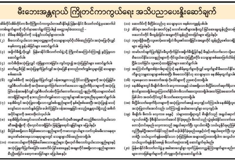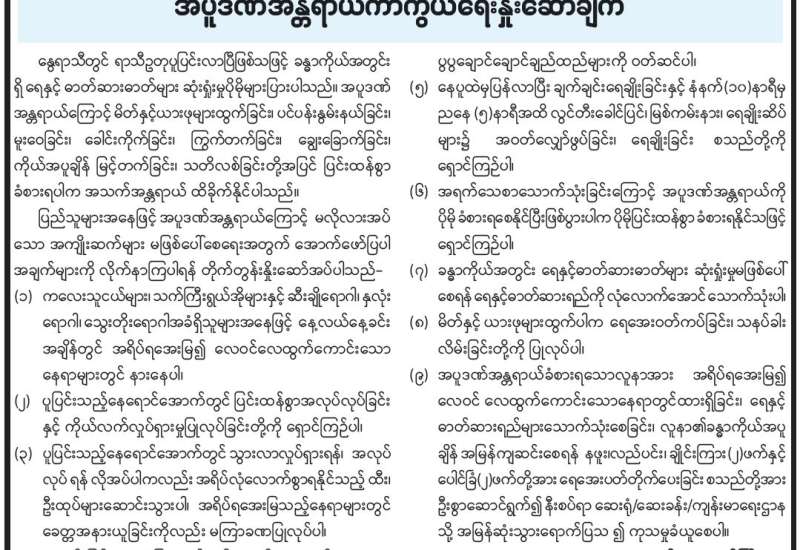 • ကျန်းမာရေးနှင့်အားကစားဝန်ကြီးဌာနမှ ထုတ်ပြန်ထားသည့် “ရုံးလုပ်ငန်းဌာနများတွင် COVID-19 ရောဂါကာကွယ်ရန်အတွက် ဆောင်ရွက်ရမည့် လုပ်ငန်းလမ်းညွှန်” နှင့် “တစ်ဦးကို တစ်ဦး အသိပေးခြင်း/ သတိပေးခြင်း မိသားစုစီမံချက်” အတိုင်း COVID-19 ရောဂါ ကာကွယ် ရေးနည်းလမ်းများအား အသိပေးခြင်းနှင့် သတိပေးခြင်းတို့ကို လူတိုင်း၊ မိသားစုတိုင်းမှ တက်ကြွစွာ ပူးပေါင်း ပါဝင် ဆောင်ရွက်ကြပါရန် မေတ္တာရပ်ခံပါသည်။
