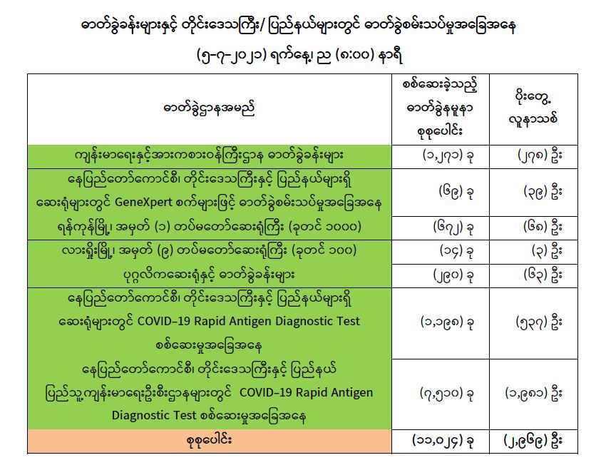 (၄-၇-၂၀၂၁) ရက်နေ့၊ ည (၈:၀၀) နာရီမှ (၅-၇-၂၀၂၁) ရက်နေ့၊ ည (၈:၀၀) နာရီအတွင်း ဓာတ်ခွဲနမူနာစုစုပေါင်း (၁၁,၀၂၄) ခုအား စစ်ဆေးပြီးစီးခဲ့ရာ COVID-19 ရောဂါ ဓာတ်ခွဲ အတည်ပြု လူနာသစ် (၂,၉၆၉) ဦး တွေ့ရှိရပါသည်။ သို့ဖြစ်ပါ၍ ယနေ့အထိ ဓာတ်ခွဲနမူနာ စုစုပေါင်း (၂,၇၈၃,၃၈၅)ခု အား စစ်ဆေးခဲ့ပြီး COVID-19 ဓာတ်ခွဲအတည်ပြုလူနာ စုစုပေါင်း (၁၆၈,၃၇၄) ဦးရှိပြီ ဖြစ်ပါသည်။