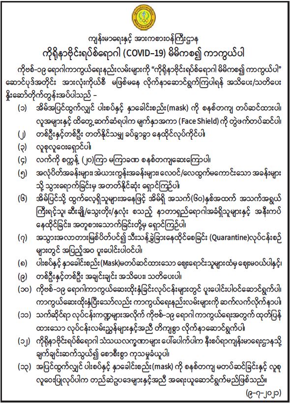 ကိုရိုနာဗိုင်းရပ်စ်ရောဂါ (COVID-19) မိမိကစ၍ ကာကွယ်ပါ
