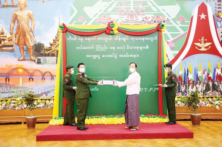 တပ်မတော်အနေဖြင့် ကိုဗစ်-၁၉ ရောဂါ ပထမလှိုင်း စတင်ဖြစ်ပွားသည့်အချိန်မှစ၍ ရောဂါကာကွယ်၊ ထိန်းချုပ်၊ ကုသရေးလုပ်ငန်းများကို အဘက်ဘက်မှ ပူးပေါင်းပါဝင်ဆောင်ရွက်ခဲ့ပြီး ဒုတိယလှိုင်းဖြစ်ပွား သည့်ကာလတွင် တပ်မတော်(ကြည်း၊ ရေ၊ လေ) မိသားစုများ၏လှူဒါန်းငွေ ၄ ဒသမ ၇၀၄ ဘီလီယံကို ပေးအပ်လှူဒါန်း၍ အဆိုပါ လှူဒါန်းငွေများဖြင့် အရပ်ဘက်ပြည်သူ့ဆေးရုံ ၁၁၆၈ ရုံနှင့် ကျေးလက် ကျန်းမာရေးဌာန၁၀၇၀ကိုကိုဗစ်-၁၉ရောဂါကာကွယ်၊ထိန်းချုပ်၊ ကုသရေး ဆေးနှင့်ဆေးပစ္စည်းများ ဝယ်ယူ၍ သက်ဆိုင်ရာဆေးရုံများသို့ အရောက်ပို့ဆောင် လှူဒါန်းခဲ့ကြောင်း သိရသည်။