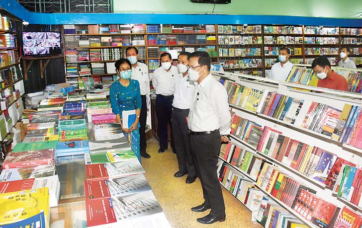 ရှေးဦးစွာ ပြည်ထောင်စုဝန်ကြီးသည် စာပေဗိမာန်စာအုပ် အရောင်းဆိုင်နှင့် စာပေဗိမာန် စာကြည့်တိုက်တို့ကို လှည့်လည်ကြည့်ရှု စစ်ဆေးသည်။