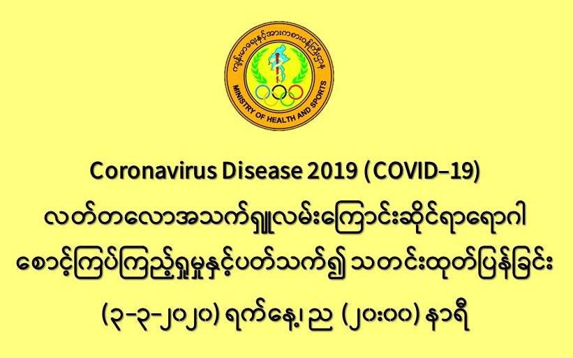 ၆။      (၃-၃-၂၀၂၀) ရက်နေ့အထိ မြန်မာနိုင်ငံတွင် COVID-19 ရောဂါ ဓာတ်ခွဲအတည်ပြုလူနာ မတွေ့ရှိသေးသော်လည်း ရောဂါစောင့်ကြပ်ကြည့်ရှုခြင်းလုပ်ငန်းများကို အရှိန်အဟုန်မြှင့်၍ ဆောင်ရွက် လျက်ရှိပါသည်။ ယခုအခါ တရုတ်ပြည်သူ့သမ္မတနိုင်ငံနှင့် အိမ်နီးချင်းနိုင်ငံအချို့ အပါအဝင် ကမ္ဘာ့နိုင်ငံ (၆၄) နိုင်ငံတွင် COVID-19 ရောဂါ ကူးစက်ဖြစ်ပွားလျက်ရှိသဖြင့် ပြည်သူလူထုအနေဖြင့် ကျန်းမာရေး နှင့်အားကစားဝန်ကြီးဌာနမှ ထုတ်ပြန်ထားသော ရောဂါကာကွယ်ရေးဆိုင်ရာ ကျန်းမာရေးအသိပညာ ပေးအချက်အလက်များအား တိကျစွာလိုက်နာဆောင်ရွက်ရန် ထပ်မံတိုက်တွန်းနှိုးဆော်အပ်ပါသည်။