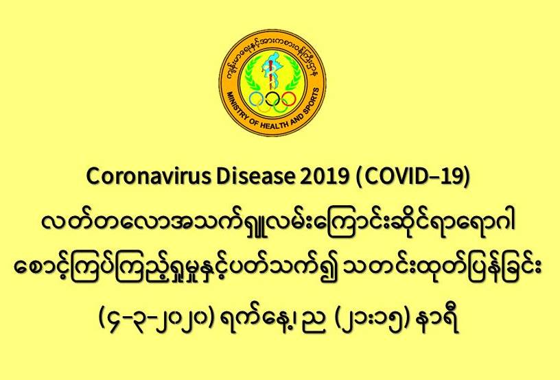 ၁။ ကျန်းမာရေးနှင့်အားကစားဝန်ကြီးဌာနသည် COVID-19 ရောဂါကာကွယ်ထိန်းချုပ်ရေးလုပ်ငန်းများကို အရှိန်အဟုန်ဖြင့် ဆက်လက်ဆောင်ရွက်လျက်ရှိပြီး သံသယလူနာ၊ စောင့်ကြည့်လူနာနှင့် COVID-19 ရောဂါ ဖြစ်ပွားသူနှင့် ထိတွေ့ခဲ့သူများထံမှ ဓာတ်ခွဲနမူနာများရယူ၍ အမျိုးသားကျန်းမာရေး ဓာတ်ခွဲမှု ဆိုင်ရာဌာန (ရန်ကုန်) တွင် စစ်ဆေးလျက်ရှိပါသည်။