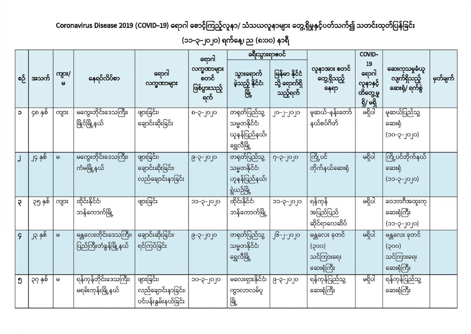 (က) မကွေးတိုင်းဒေသကြီး၊ မြိုင်မြို့နယ်တွင် နေထိုင်သော အသက် (၄၈) နှစ်အရွယ် အမျိုးသားတစ်ဦးသည် တရုတ်ပြည်သူ့သမ္မတနိုင်ငံ၊ ယူနန်ပြည်နယ်မှ (၂၀-၂-၂၀၂၀) ရက်နေ့တွင် မြန်မာနိုင်ငံ၊ မူဆယ်မြို့သို့ ပြန်လည်ရောက်ရှိလာခဲ့ပြီး (၁၀-၃-၂၀၂၀) ရက်နေ့တွင် မူဆယ်မြို့မှ ရွှေလီမြို့သို့ပြန်လည်ထွက်ခွာခဲ့ရာ မူဆယ်နယ်စပ်ဂိတ်၌ အဖျားစစ်ဆေးချိန်တွင် ကိုယ်အပူချိန်မြင့်တက်လျက်ရှိကြောင်း တွေ့ရှိရသဖြင့် ၎င်းအားစစ်ဆေးခဲ့ရာ (၈-၃-၂၀၂၀) ရက်နေ့တွင် မှစတင်၍ ဖျားခြင်း၊ ချောင်းဆိုးခြင်း လက္ခဏာများခံစားခဲ့ရကြောင်းတွေ့ရှိရသဖြင့် မူဆယ်ပြည်သူ့ဆေးရုံတွင် သီးခြား ထားရှိကုသမှုပေးလျက်ရှိပါသည်။