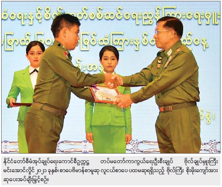 ထို့နောက် နိုင်ငံတော်စီမံအုပ်ချုပ်ရေးကောင်စီဥက္ကဋ္ဌ တပ်မတော်ကာကွယ်ရေးဦးစီးချုပ်က ပြည်သူ့ ဆက်ဆံရေးနှင့် စိတ်ဓာတ်စစ်ဆင်ရေးညွှန်ကြားရေးမှူးရုံး ကွပ်ကဲမှုအောက် တပ်ကျောင်းများမှ နိုင်ငံတော်အဆင့် ပြည်တွင်းပြိုင်ပွဲများနှင့် ပြည်ပပြိုင်ပွဲများတွင် ဆုရရှိခဲ့ကြသည့် အရာရှိ၊ စစ်သည်၊ အစားခန့်ဝန်ထမ်းများအား ဆုများပေးအပ်ချီးမြှင့်ရာ ၂၀၂၁ ခုနှစ်၊ စာပေဗိမာန်စာမူဆု လူငယ်စာပေ ပထမဆုရရှိသည့် ဗိုလ်ကြီးစိုးမိုးကျော်၊ ၂၀၂၁ ခုနှစ်၊ စာပေဗိမာန်စာမူဆု ကလေးစာပေ ပထမဆုရရှိသည့် ဗိုလ်ကြီးသက်နောင်၊ ရုရှားနိုင်ငံတွင် ကျင်းပပြုလုပ်သည့် နိုင်ငံတကာ တပ်မတော်အားကစားပြိုင်ပွဲ၊ ရိုးရာယဉ်ကျေးမှုပြိုင်ပွဲတွင် အဆို၊ အက၊ အတီး ပြိုင်ပွဲ၌ ဆုရရှိခဲ့သည့် မြဝတီတေးဂီတနှင့် အငြိမ့်အဖွဲ့ကိုယ်စား တပ်ကြပ်အောင်အောင်ထက်နှင့် ဒုတိယအရာခံဗိုလ် (အစားခန့်) ဒေါ်သန္တာလင်းတို့က ဆုများလက်ခံရယူကြသည်။